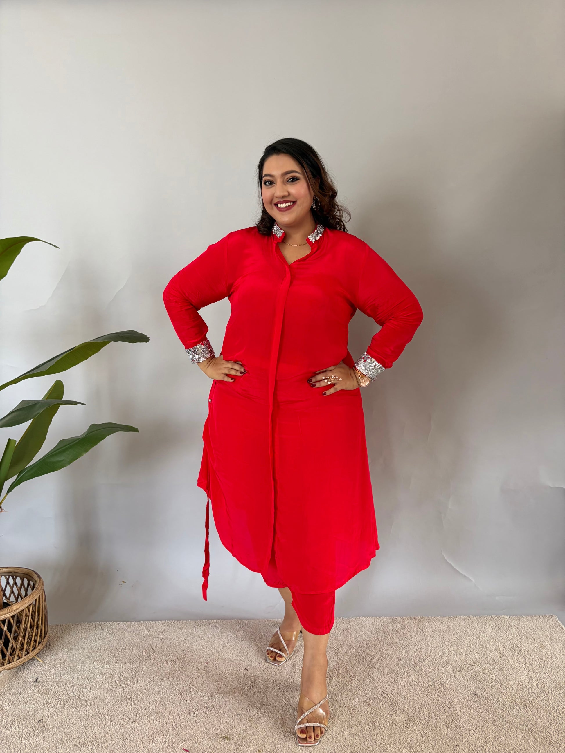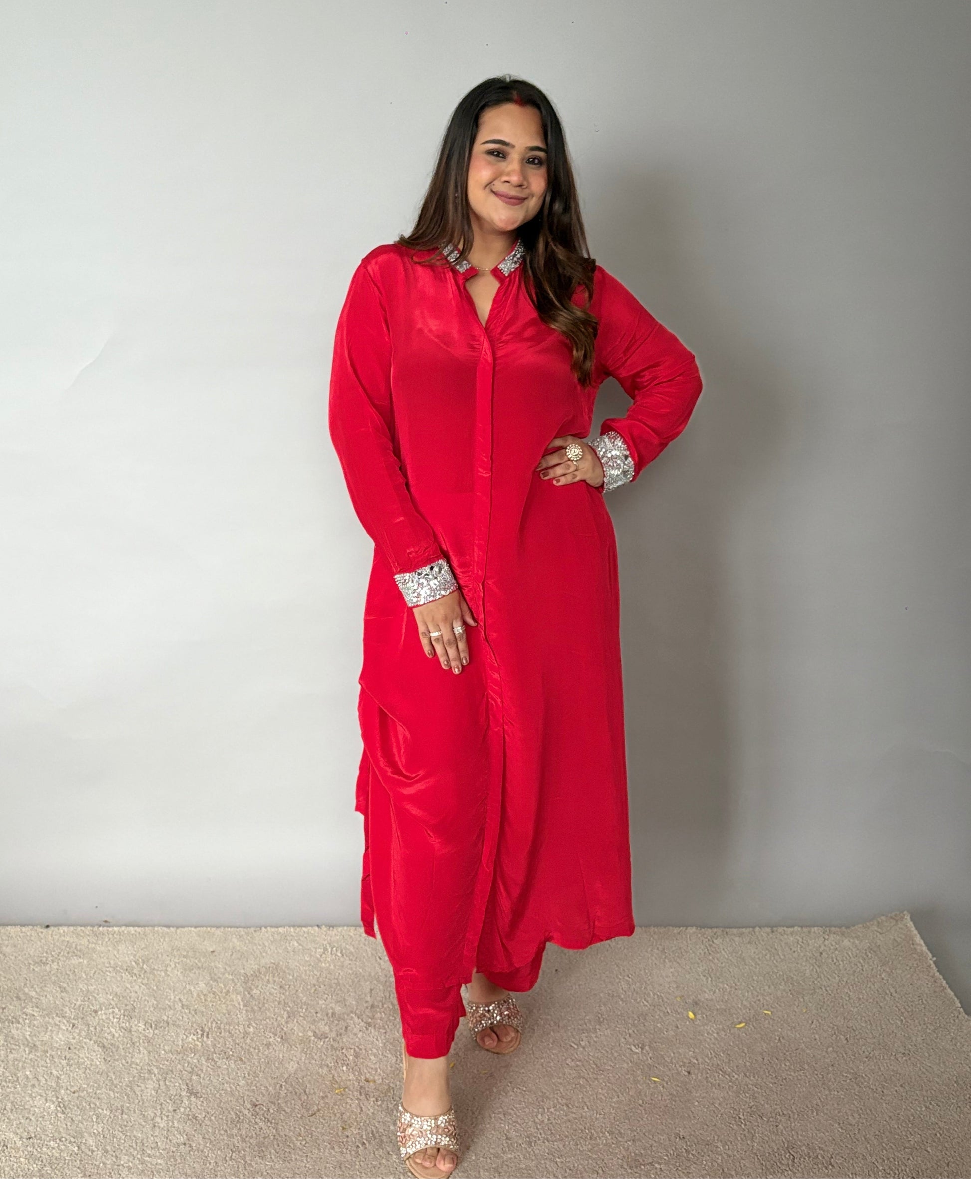 Turn heads with this elegant red cord set, crafted for both comfort and style. The outfit features a sleek long kurta paired with straight-fit trousers, designed in a rich red fabric that flows beautifully. Silver embellished detailing on the collar and cuffs adds a touch of sparkle, making it perfect for festive occasions, parties, or evening gatherings. The contemporary cut combined with traditional accents makes this set a versatile choice for modern wardrobes.
