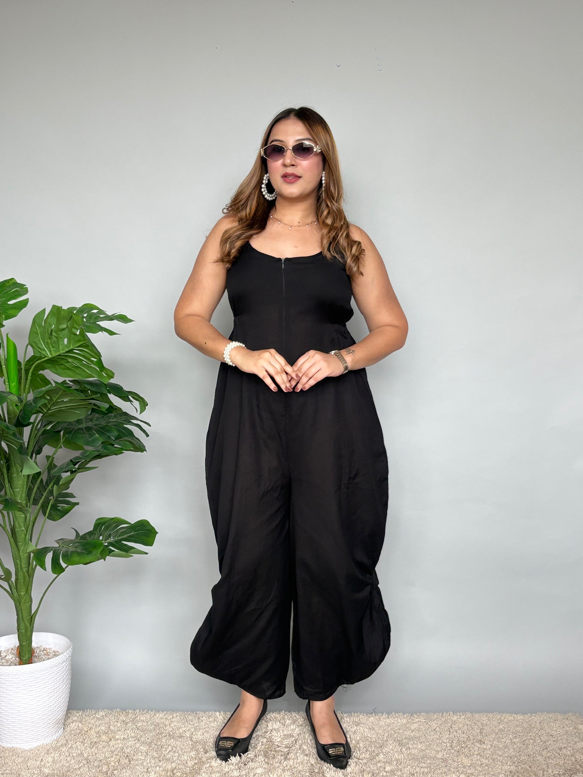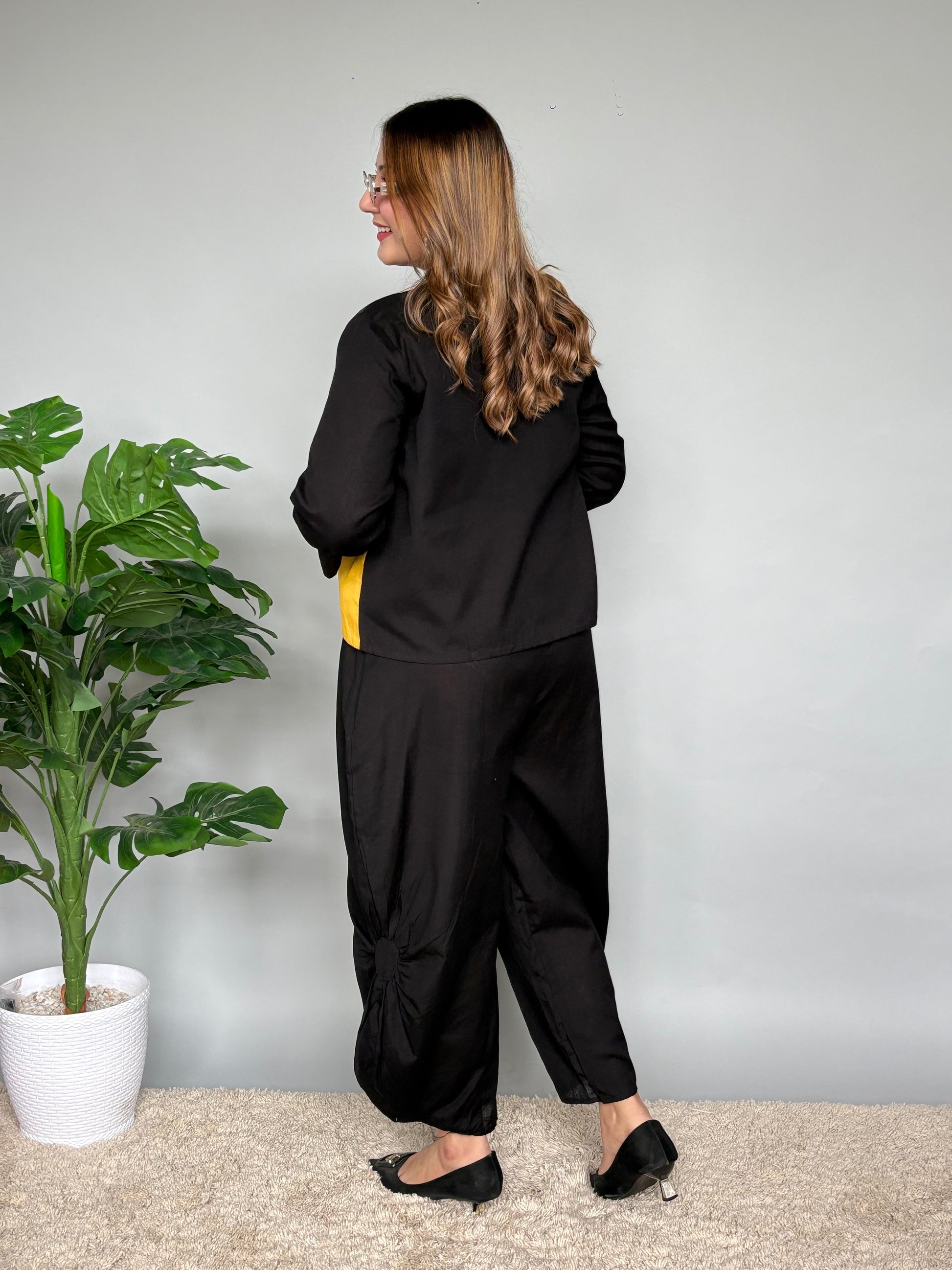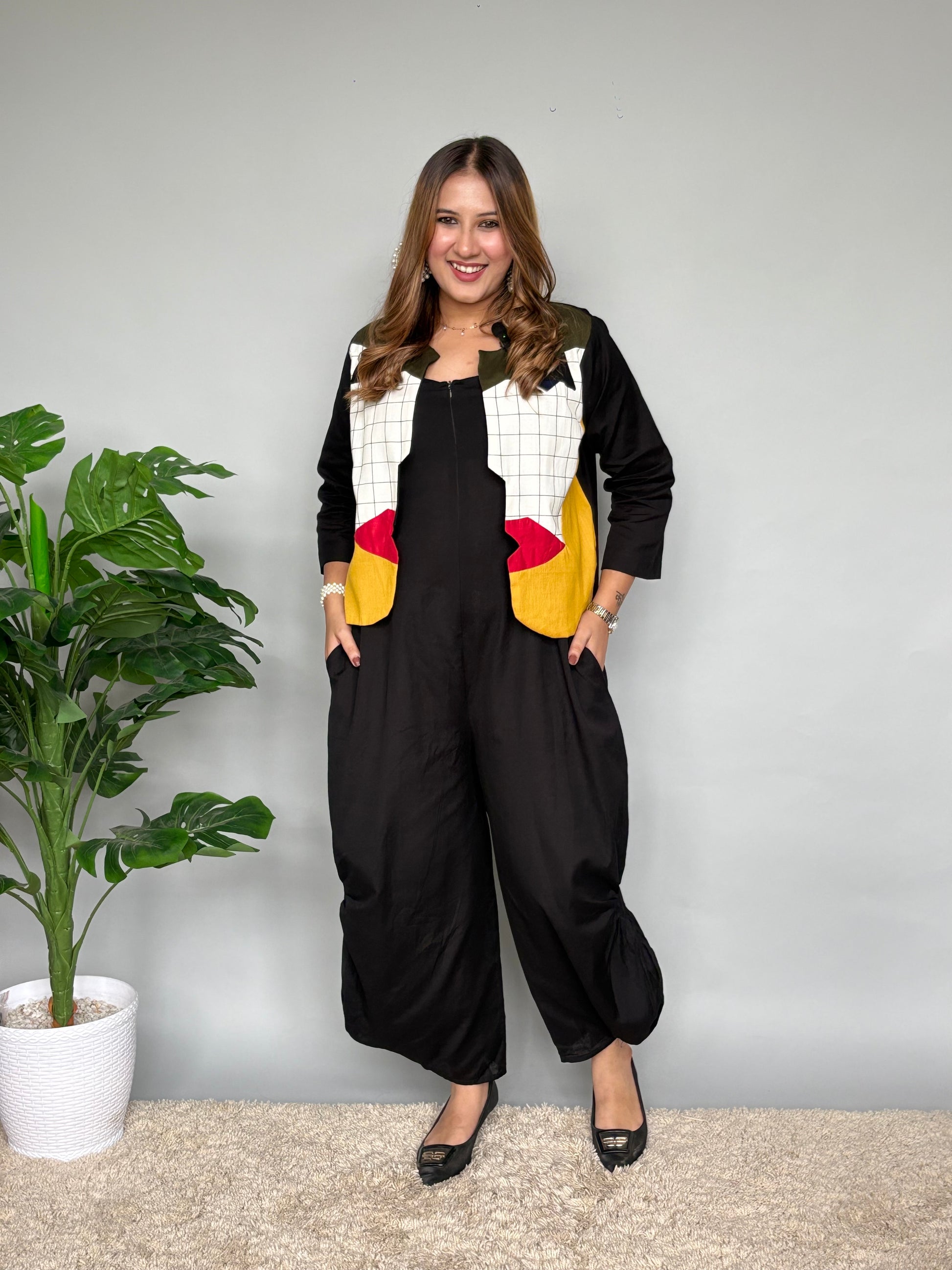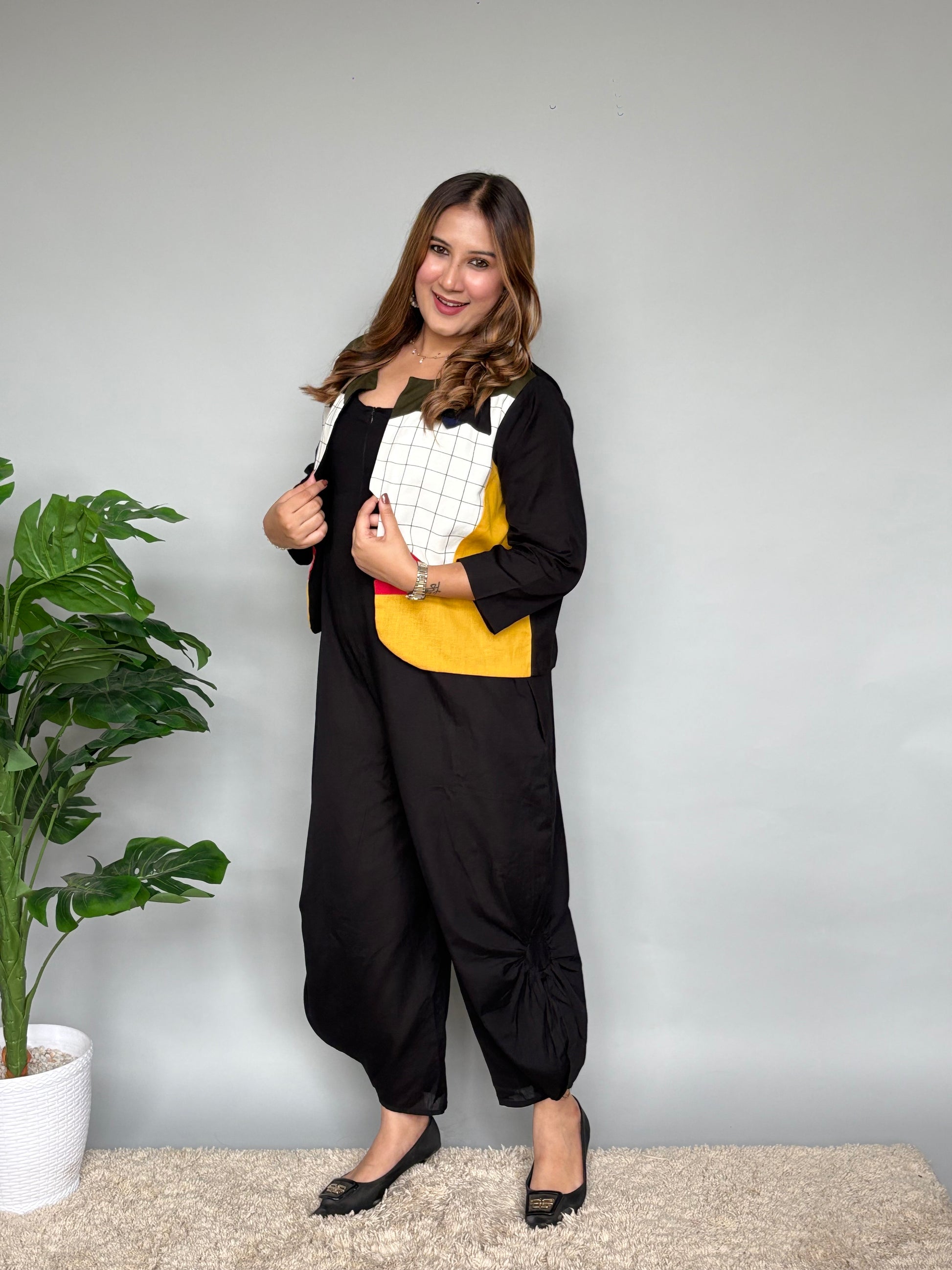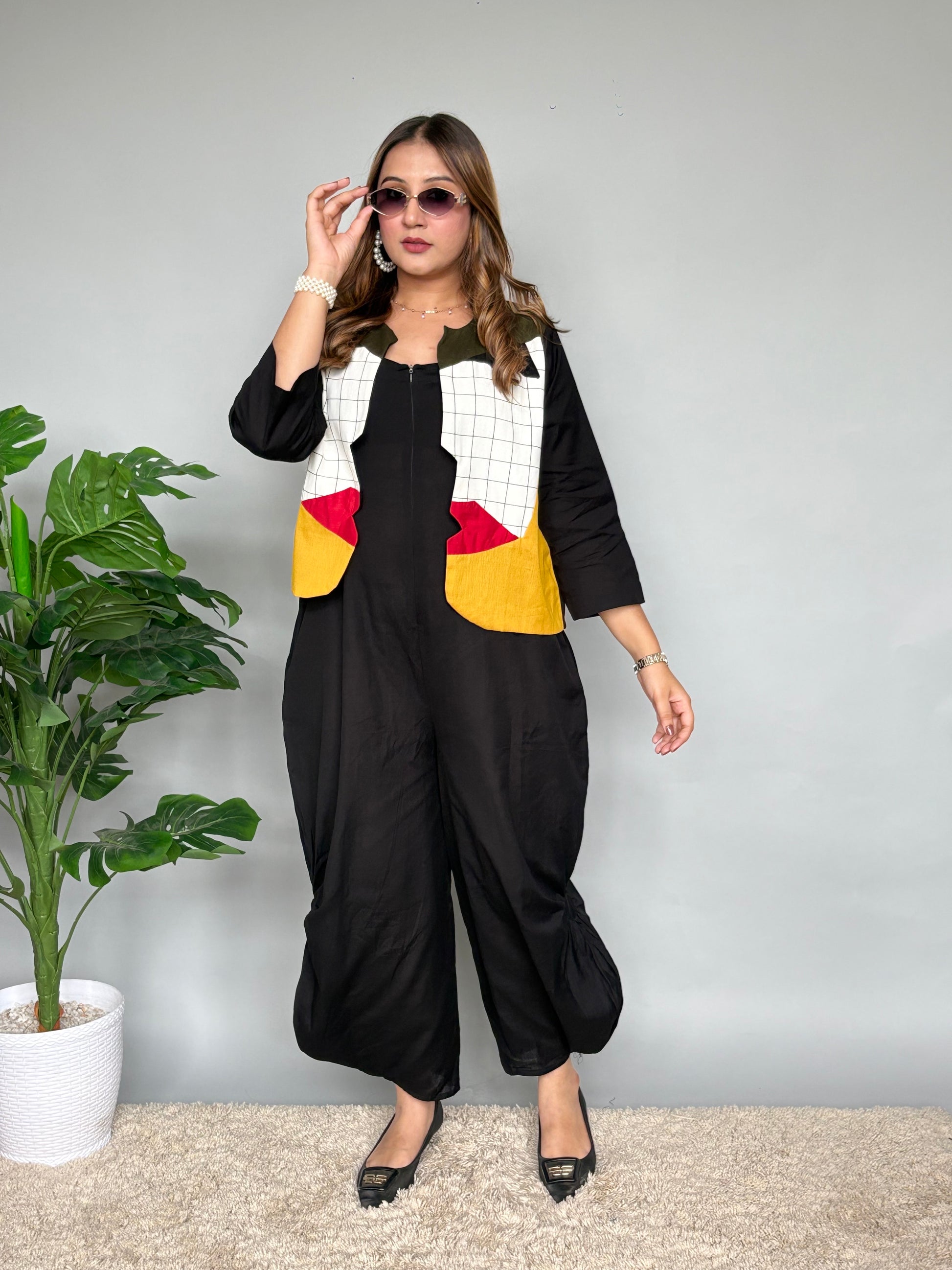 Elevate your style with this chic black jumpsuit paired with a vibrant colourblock jacket. The solid black jumpsuit features a relaxed fit and soft, flowy fabric that ensures all-day comfort and effortless movement. It is beautifully layered with a statement jacket designed with bold colour-blocked panels in mustard yellow, red, and olive green, balanced with a modern grid print. Perfect for casual outings or semi-formal gatherings, this set brings a perfect mix of contemporary charm and playful vibrancy.