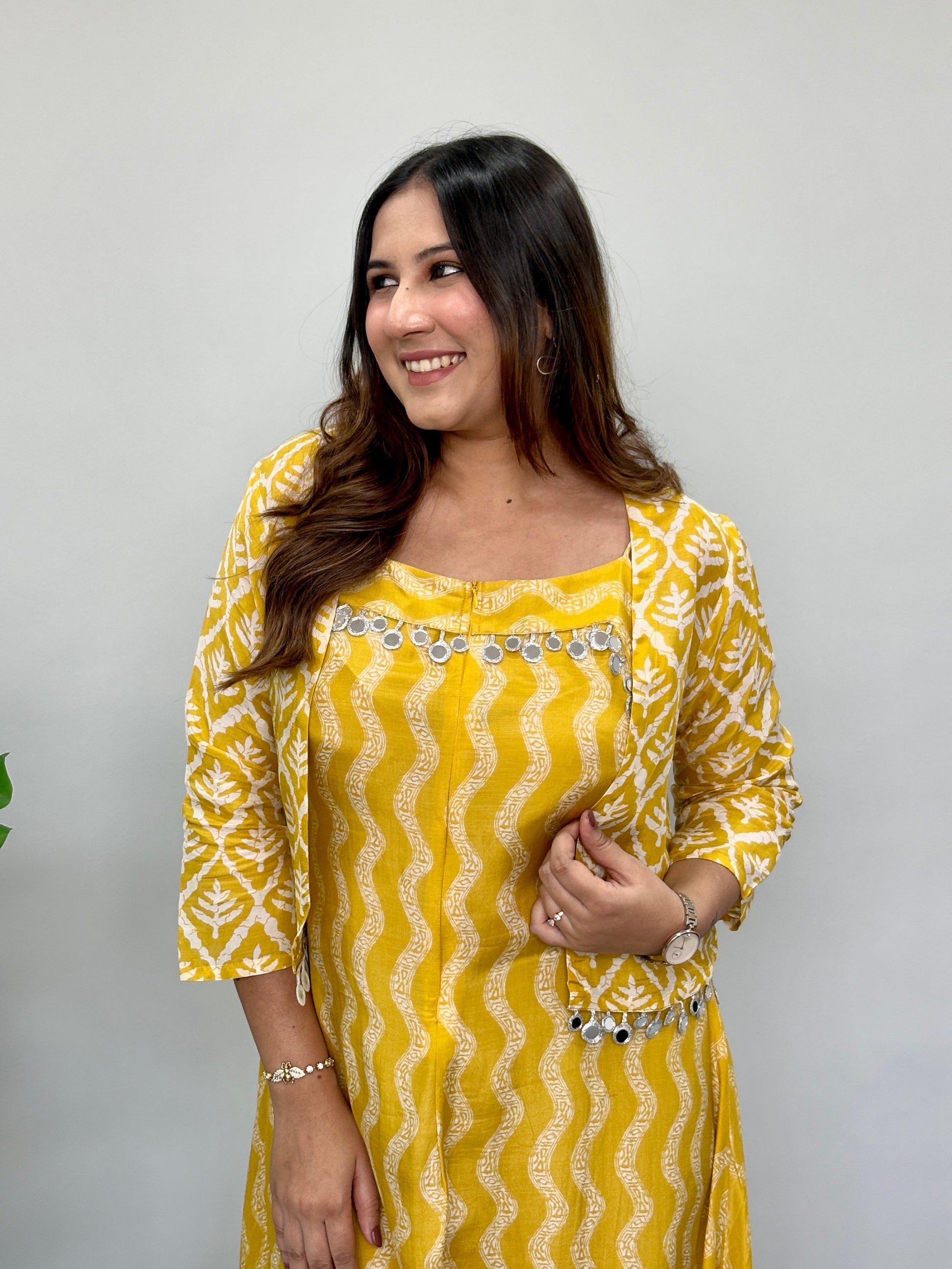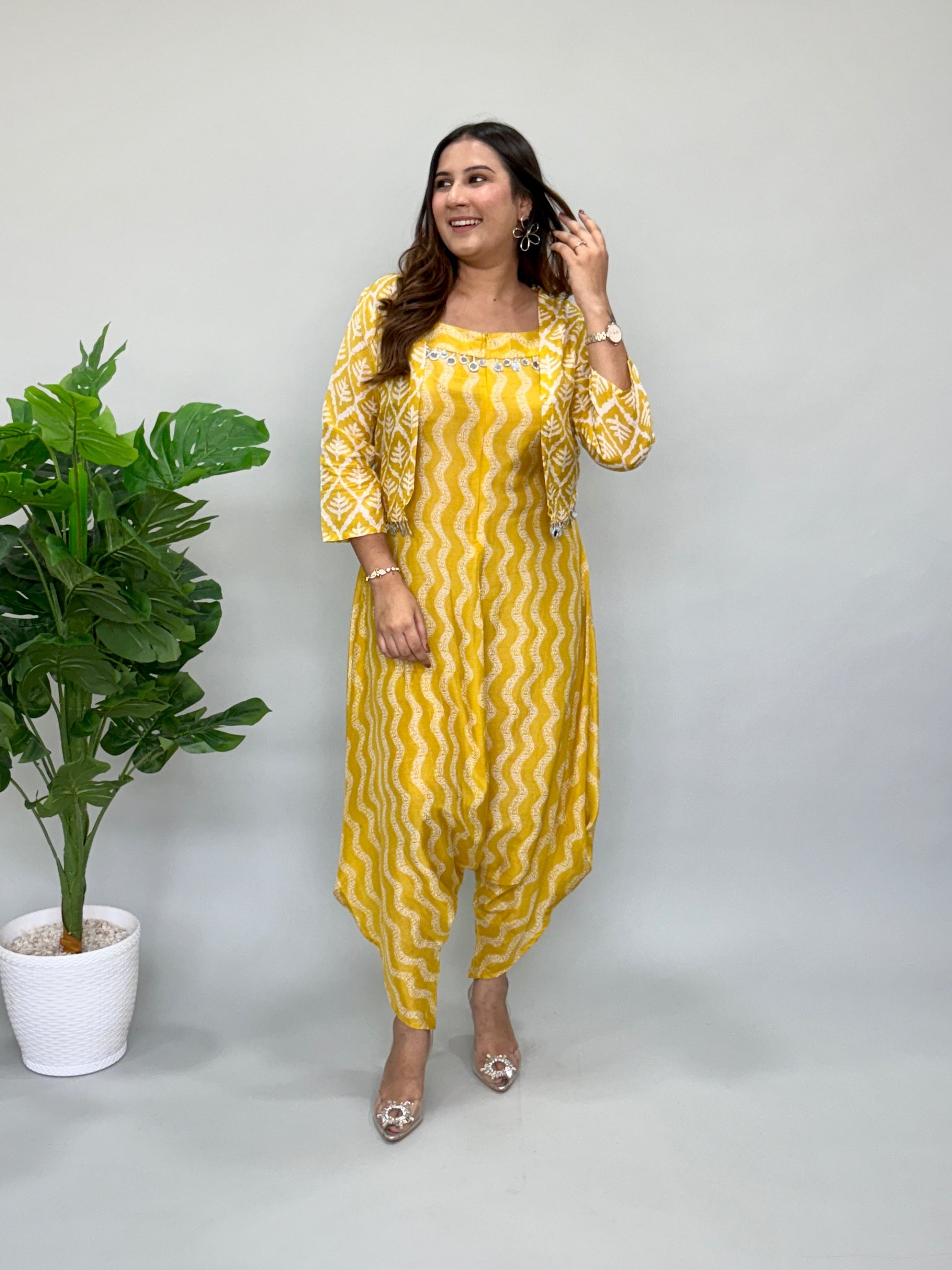 Vibrant yellow jumpsuit with jacket featuring a comfortable and flowy silhouette. The design includes a stylish draped hem and intricate detailing around the neckline, making it perfect for casual or semi-formal occasions. It’s both elegant and easy to wear, combining style with comfort.