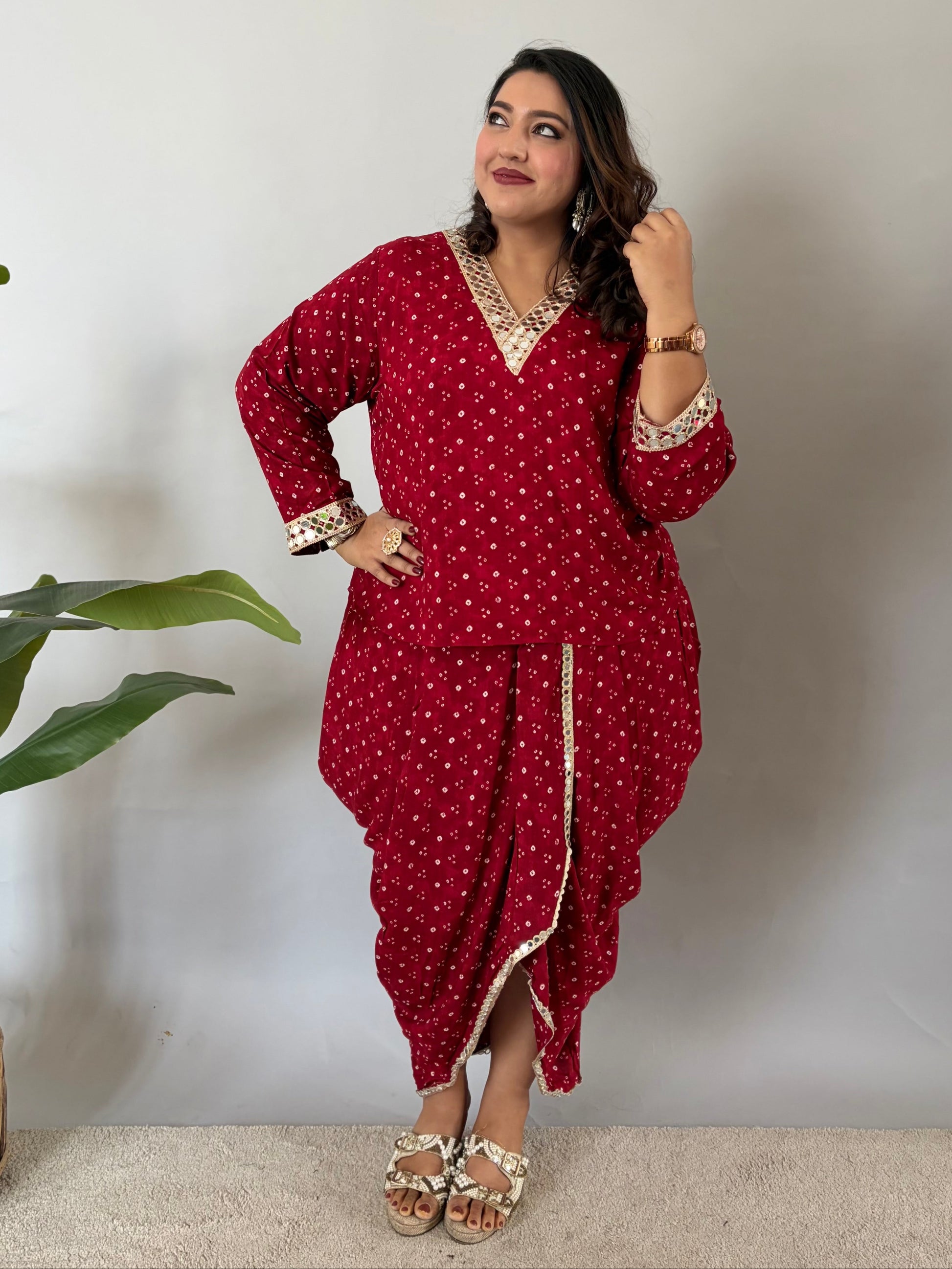 Step into timeless elegance with this vibrant red bandhani print skirt set. The outfit features a graceful V-neck kurta embellished with mirrorwork detailing along the neckline and cuffs, adding the perfect touch of sparkle. Paired with a beautifully draped skirt showcasing traditional bandhani prints and a delicate golden border, this set blends ethnic charm with modern sophistication.