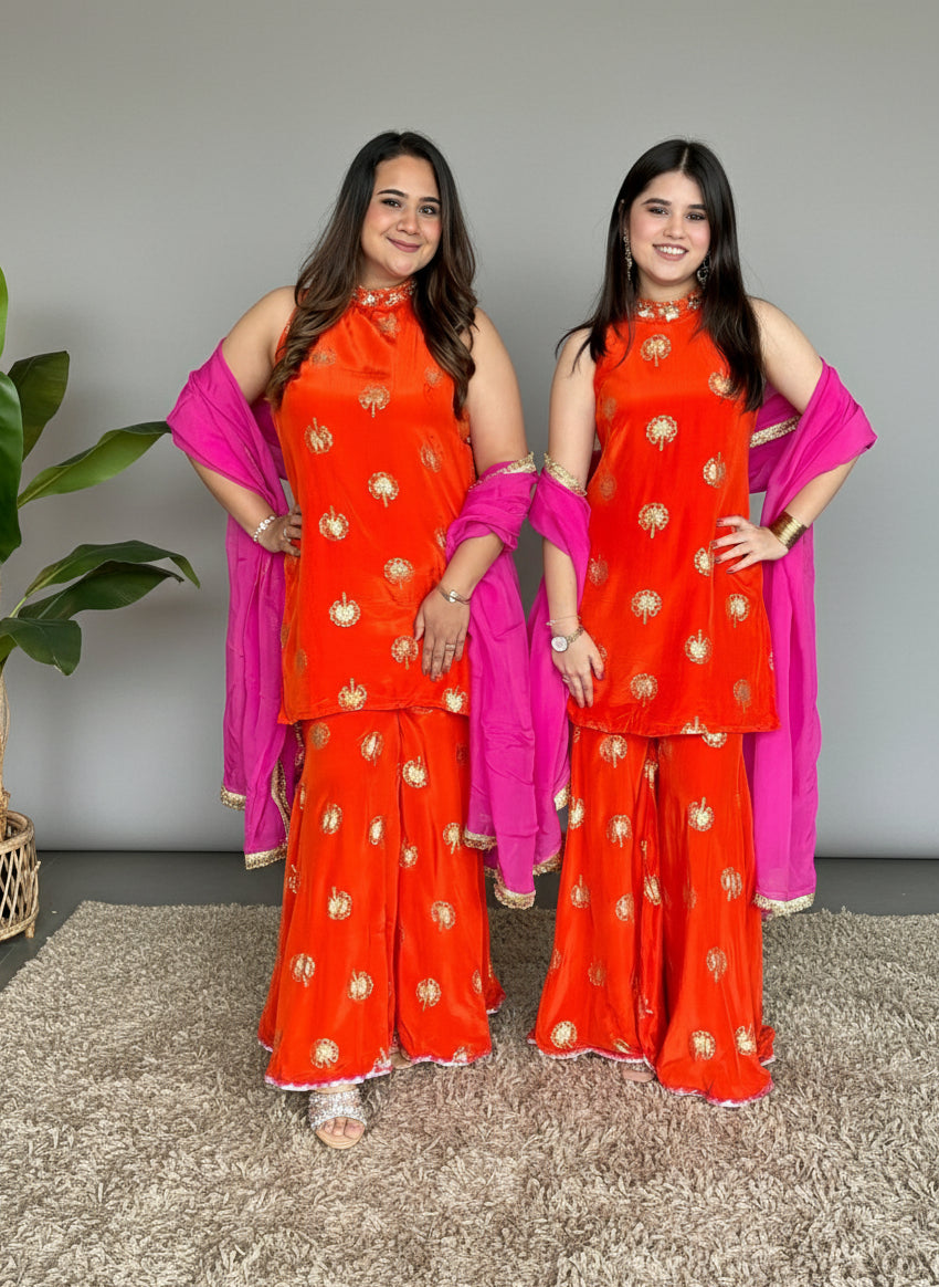 Radiate festive charm with this vibrant orange sharara set, crafted in luxurious fabric with delicate golden detailings all over. The sleeveless kurta features a stylish halter neckline adorned with intricate embellishments, paired with flared sharara pants for an elegant and comfortable fit. A contrasting pink dupatta adds a pop of color and completes the look beautifully. Perfect for weddings, haldi ceremonies, and festive celebrations.