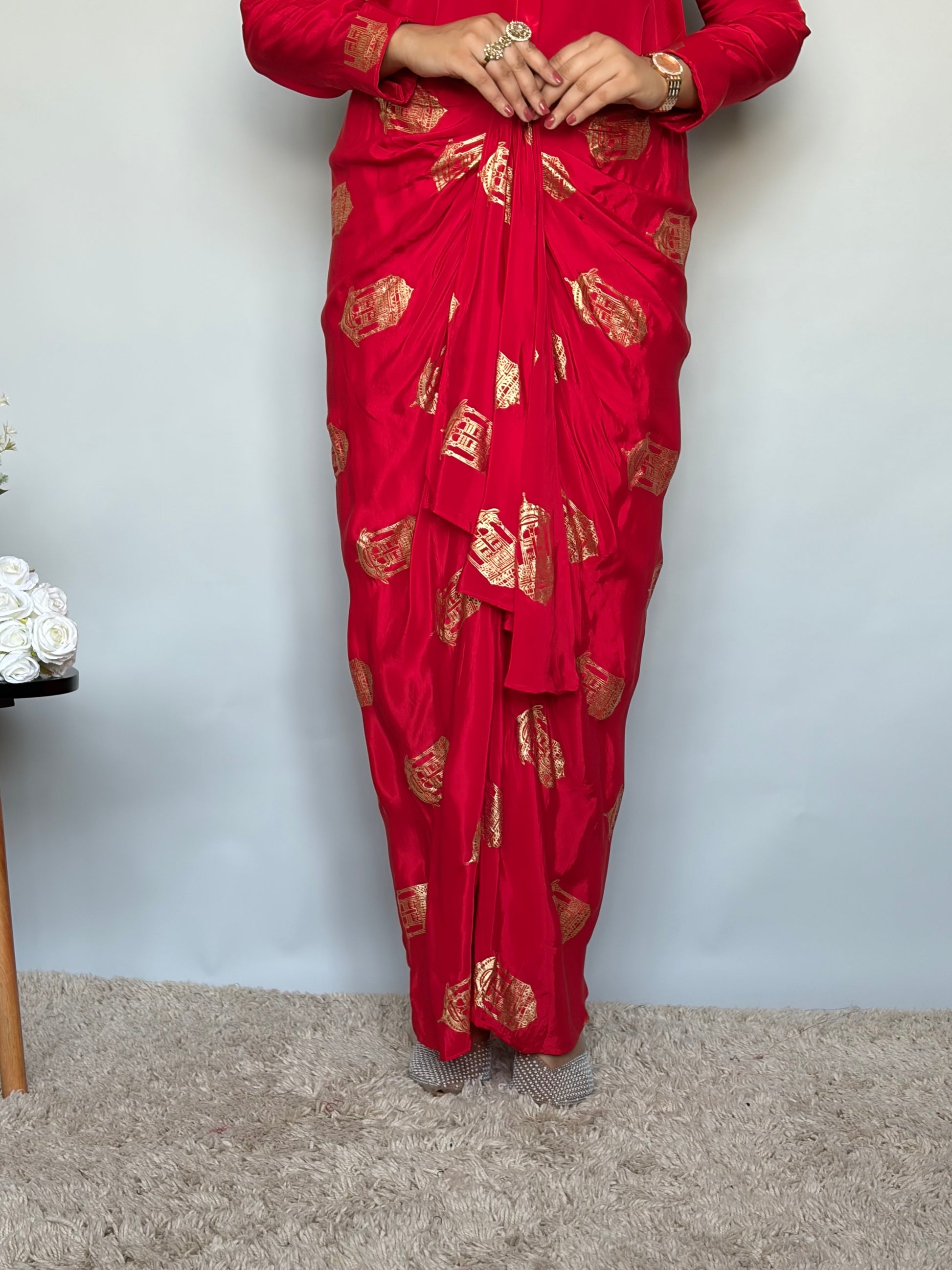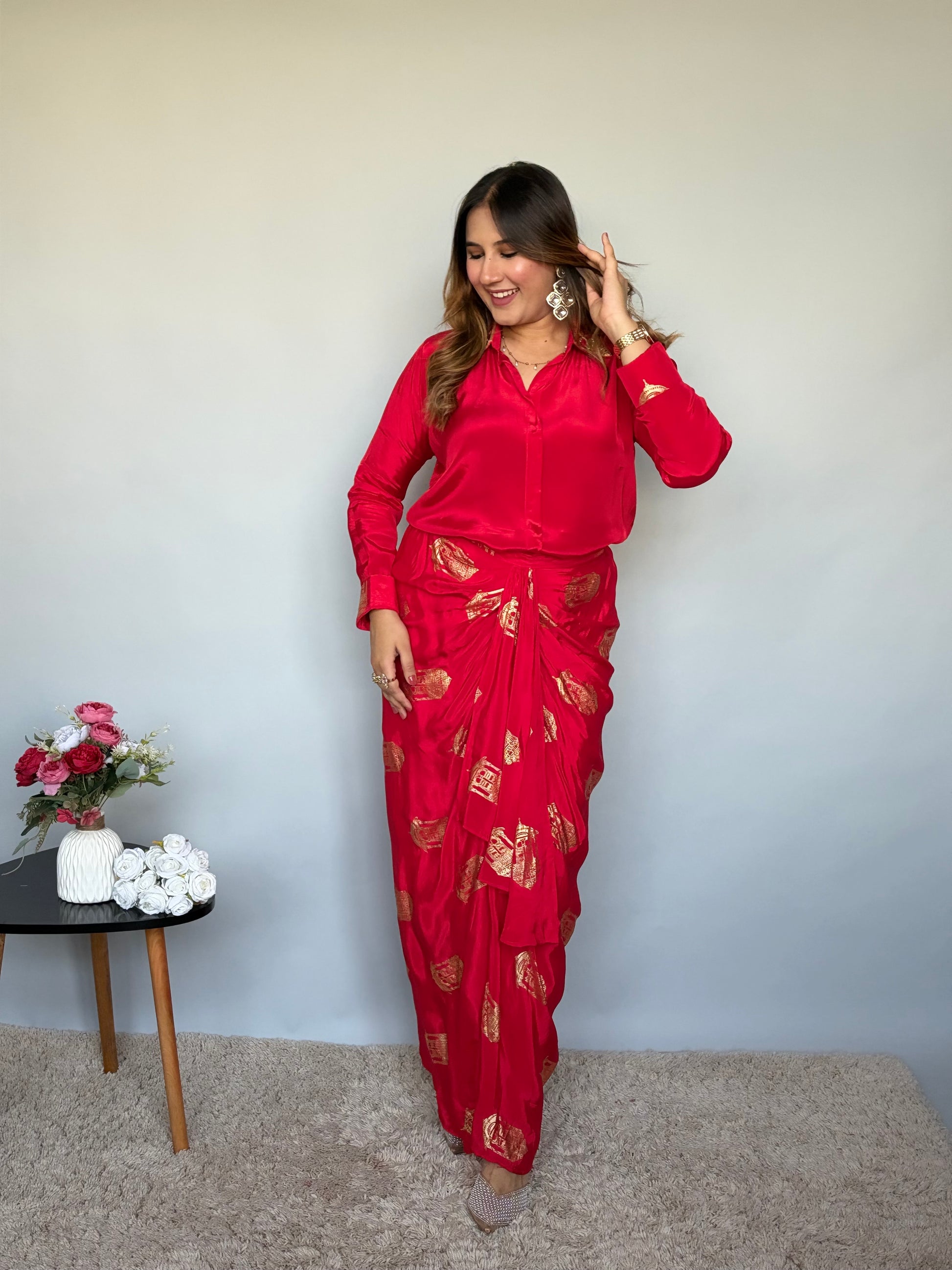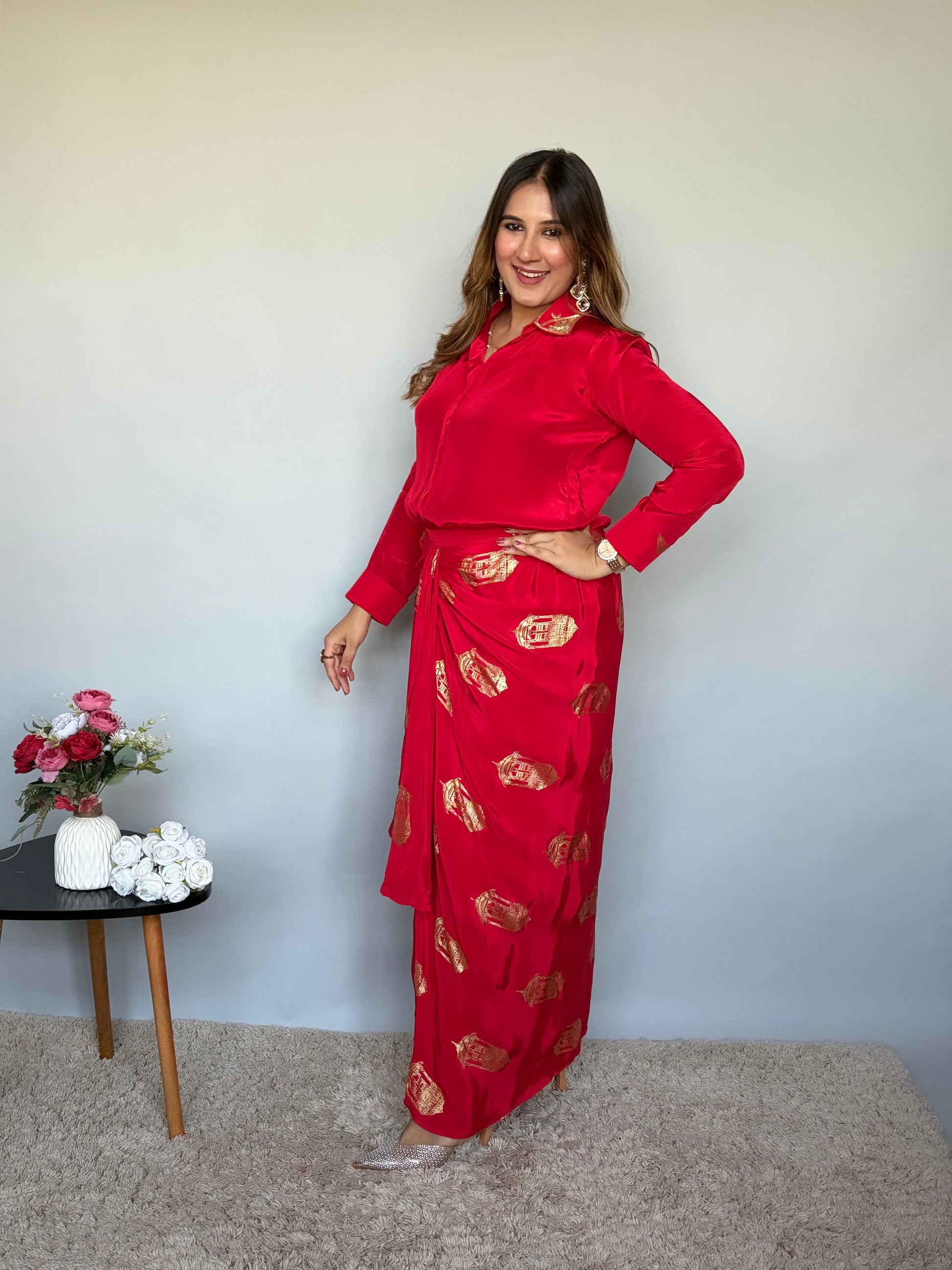 Red Skirt Set with Metallic Print
